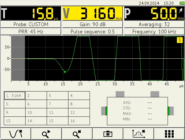 The instrument can drive the widest range of ultrasonic transducers in the frequency range from 20 KHz to 1 MHz for through-transmitting up to 15 meters of concrete. Apart of use of regular pietoelectric probes, Dry-Point-Contact transducers and transducer arrays can be applied for couplant-free operation on arbitrary surface condition.